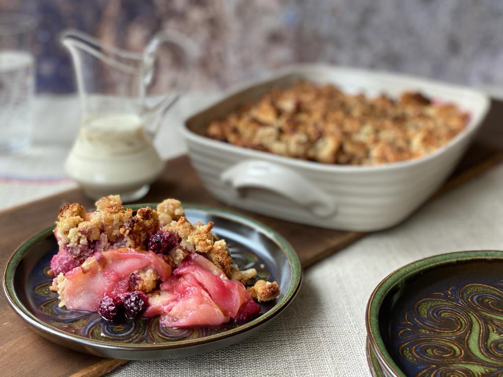 The topping takes minutes to make and it’s the perfect comfort food, especially when served with cream or vanilla custard.
