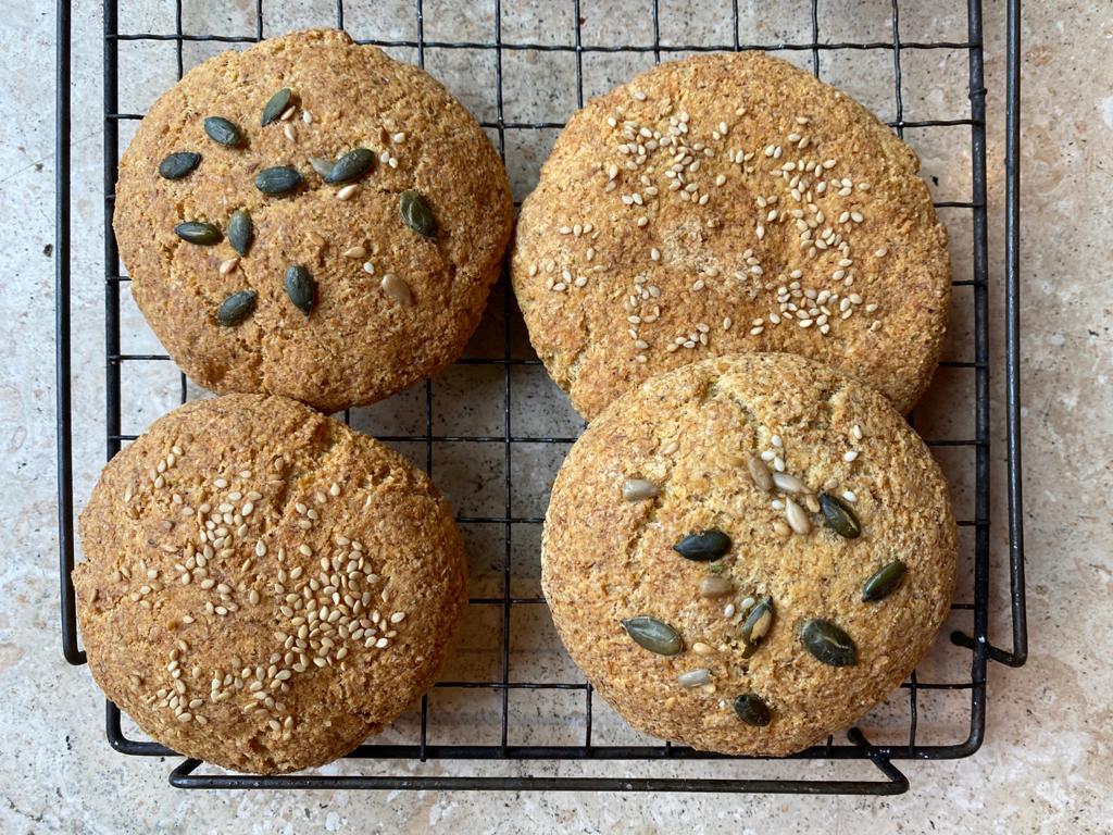 Way up high in the mountains on a skiing holiday to the Dolomites I learnt to cook a local bread packed with nuts, seeds and the mild, spicy taste of caraway. This is my low-carb gluten-free version of the mountain bread. Do use an inexpensive cow’s milk mozzarella, the sort you would use on pizza. Flaxseed (also known as linseed) is either dark brown or golden. The golden gives a better colour to your bread. It is easy to grind your own from the seeds in a food processor. Do keep the seeds in the fridge or freezer as they can become rancid. We love these rolls for a simple lunch with butter and cheddar cheese or smoked salmon, cream cheese and cucumber.